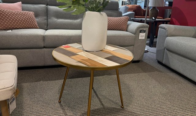 Add a touch of charm and originality to your space with this stylish side table from CJ Marketing. Featuring a unique multicolor wood plank top and a sleek golden metal frame, this round side table strikes the perfect balance between rustic warmth and modern flair.