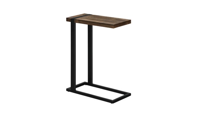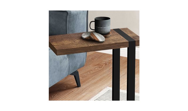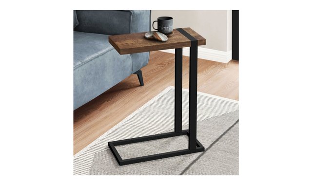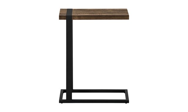 Industrial-farmhouse style combines modern metal with a rustic wood finish to create a warm, inviting look. This C-shaped accent table embodies that popular style. The tabletop is finished in a brown reclaimed-wood look with naturalistic color variations and a subtle wood-grain texture. The robust metal frame in a black finish is incorporated into the thick tabletop for a striking visual contrast and to provide stability. Lightweight and finished on all sides, this C table can be slid under a sofa or chair in a living room or used as a side table in a bedroom. No assembled