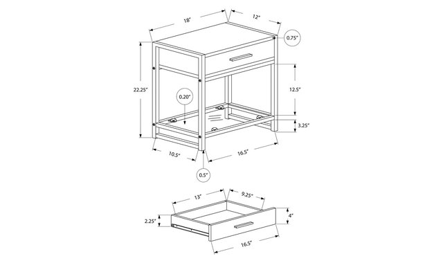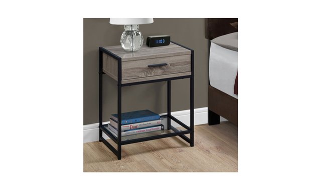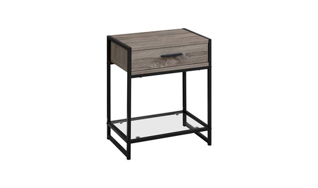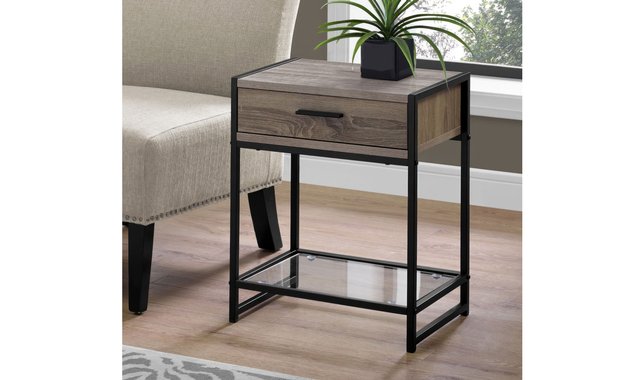 Add a trendy touch to your décor with this multi-functional side table in a contemporary design, finished with a barnwood-style wood. This compact table is perfect for placing in the living room next to your armchair or in your bedroom as a bedside table. It features a metal pull-out drawer, accented with a black handle and a tempered glass bottom open shelf useful for storing books or accessories. This versatile table is built on a sturdy black metal frame and the drawer is made of high-quality dark taupe finished MDF. It will be useful in your home for years to come! A large metal drawer with a black finish handle. Clear tempered glass bottom shelf for extra storage or to showcase a decorative item. Modern design with an elegant dark taupe barnwood finish. Sturdy black metal frame. Compact and versatile for use as a side table or bedside table. No assembled