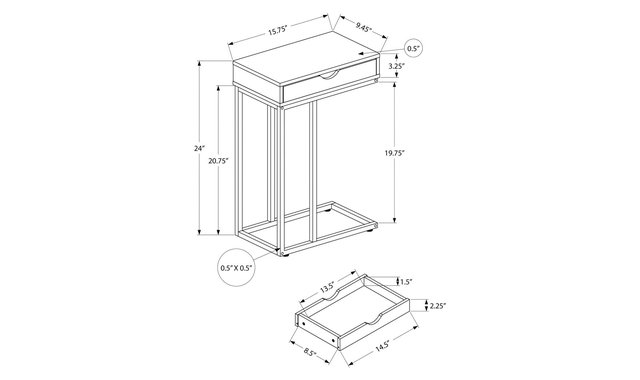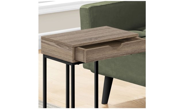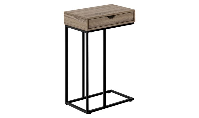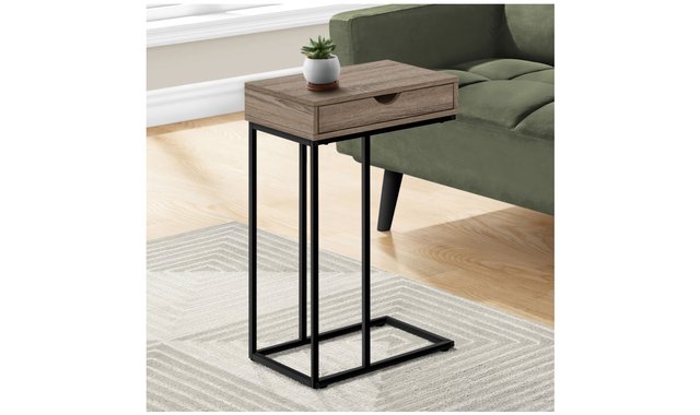 Tired of holding a drink in your hand and a bowl of popcorn in your lap while you watch in a flurry? This C-shaped table keeps them within reach so you can sit back and enjoy the show. The C-shaped base slides under your sofa or chair, placing the table surface close to you. For added convenience, the top includes a storage drawer accessible from both sides. Use it to hide mobile devices to avoid interruptions while you watch TV, then store remotes in it when you're done. Stylish and versatile, this portable side table features a smooth dark taupe laminate finish top and black metal frame that adds a modern look anywhere you need a small side table with storage. No assembled.