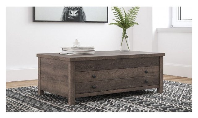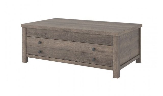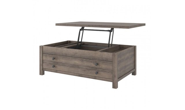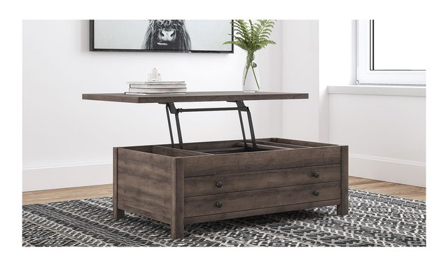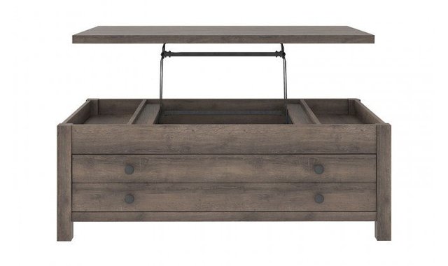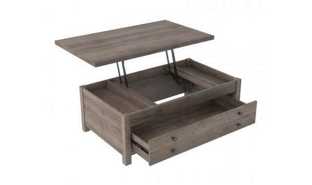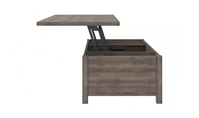 T275-9 Lift Top Cocktail Table Raise the bar on modern farmhouse design with this versatile lift top coffee table. Sporting a handsome weathered oak effect and cross buck design, this table's handy spring-loaded mechanism brings the tabletop closer to you. This versatile table makes it easier than ever to eat, work or play from the comfort of your sofa. No assembled.