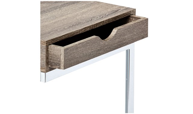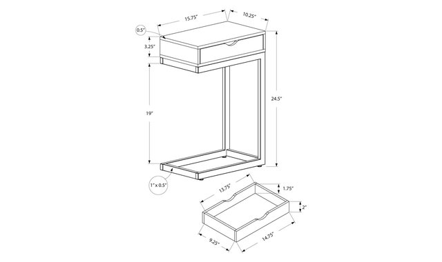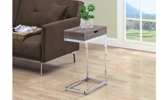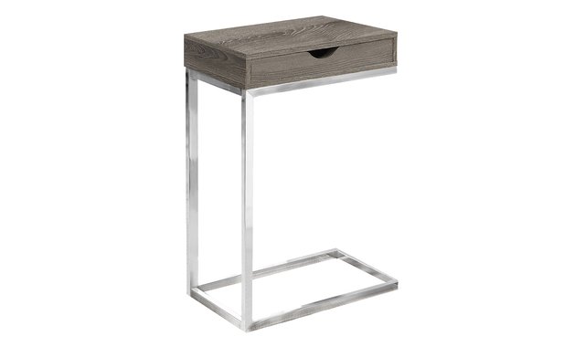 With an original aesthetic, this ultra-modern C-shaped side table is enhanced with all the practical features you need. The table is ideal for your cottage, apartment or condo and is sure to bring more style to your movie night, study session or just your relaxation time. With its taupe colour finish, there is nothing to stop you from combining it with your existing decor and furniture. The sturdy chrome-plated metal base rests lightly on the floor to prevent damage. This side table also features a convenient drawer for all your living room accessories such as remotes, coasters, magazines and more. Make it your new favourite living room item. Plenty of space for drinks, snacks, tablets or laptops. A convenient sliding drawer that slides out on either side is ideal for accessories. Chrome-plated metal base that easily slides under a sofa or chair. Contemporary styling finished with dark taupe wood fits well with any decor. Product Dimensions: 16" W x 10" D x 25" H.