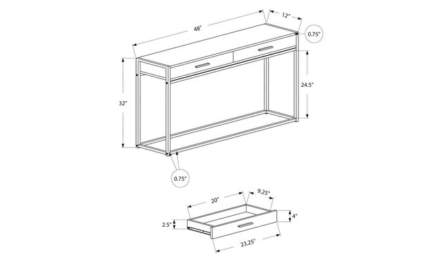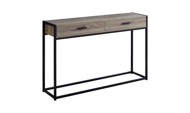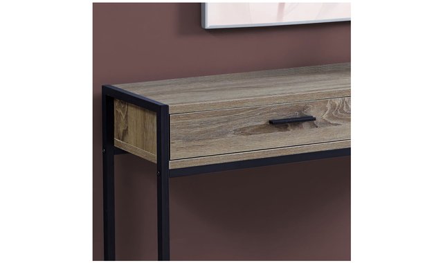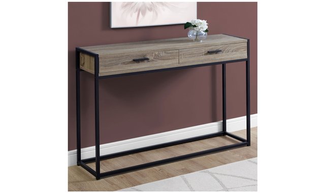 Enhance the appeal of your entryway, hallway, living room or office space with this modern rectangular side console with a touch of industrial chic. Constructed from premium MDF panels featuring a dark taupe wood finish that contrasts perfectly with the base of solid black metal. Two convenient pull-out metal drawers are ideal for storing documents and keys, while the table is suited for books, lamps, pictures and other decorative objects. This versatile and functional console table will be one of your home’s most useful furniture pieces. Assembly is required. 2 large metal drawers featuring solid black metal handles. Sturdy black metal-constructed base with a solid, clean design. Multi-functional console table that’s perfect for smaller spaces. Modern design with a contrasting grey wooden tabletop. Dark taupe wood finish to match any interior décor.