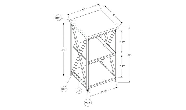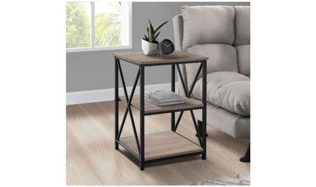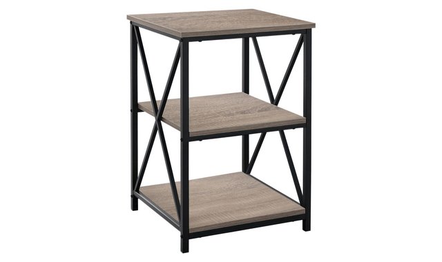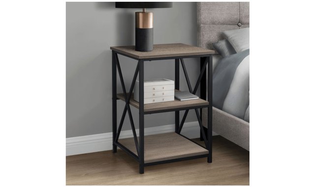 Chic side table in a simple, modern industrial design convenient for a living room or bedroom. Elegant black metal legs with contrasting, smooth dark taupe, wood look laminate tabletops. Two open bottom shelves perfect for storing books, magazines, or display decorative objects. This simple, contemporary style end table with an industrial look is a multi-functional accent piece suitable for any room. The stylish black metal legs with an X design on the two sides, contrasts with the warmth of the dark taupe wood look laminate square tops. The two open bottom shelves offer a convenient storage space for books, magazines, or decorative objects with room on top for a small lamp or a place to set down your drink. Bring it into the bedroom as a sleek and compact nightstand for a clean modern touch. Assembly is required.