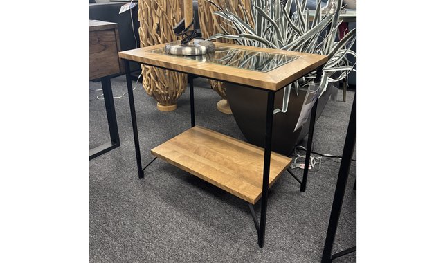 Ce modèle rectangulaire se distingue par son contour en bois massif soigneusement travaillé, qui encadre une vitre centrale pour un effet de légèreté et de contraste raffiné. Le bois, noble et authentique, apporte une présence chaleureuse, tandis que la vitre centrale capte la lumière et donne de la profondeur au design. Les pattes en fer forgé, solides et au style artisanal, assurent une excellente stabilité tout en ajoutant une touche industrielle subtile à l’ensemble.