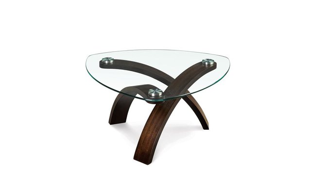 The Allure table collection brings a distinctive contemporary look and urban feel with its unique criss-crossed arched bases and shaped glass tops. Featuring bases crafted of walnut veneers and bent plywood solids and tabletops featuring tempered glass and stainless steel pucks this collection provides a unique, modern look making a bold eye-catching statement.