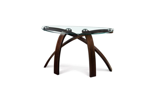 The Allure table collection brings a distinctive contemporary look and urban feel with its unique criss-crossed arched bases and shaped glass tops. Featuring bases crafted of walnut veneers and bent plywood solids and tabletops featuring tempered glass and stainless steel pucks this collection provides a unique, modern look making a bold eye-catching statement.
