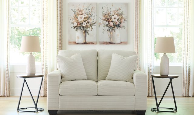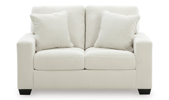 The crisp neutral hue and striking design details of this loveseat create a living room that expertly reflects your contemporary taste. For irresistibly cool textural appeal, the ultra-soft fabric is enhanced by a small-scale corded look. With a clean-lined silhouette complete with track arms, this sofa allows you to take a trend-right approach to everyday living.