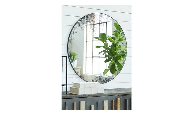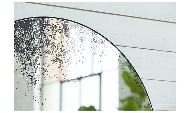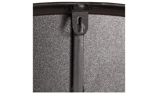 If an ultra-modern look is the direction you're going for, the Kali accent mirror is beautifully on point. Distressed glass in antiqued black gives contemporary style a striking twist. A solid black frame rounds out the design with a sense of subtle sophistication. Product Features Made with metal Antiqued black distressed glass Black finish Due to the finishing process, some variations may occur Keyhole bracket for hanging