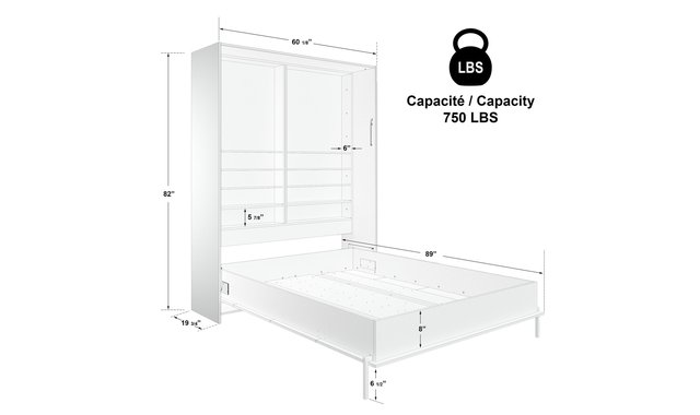 TAYLOR Double Murphy Bed – A Modern and Functional Design for Optimized Space The TAYLOR double Murphy bed is the perfect blend of elegance and practicality, designed to maximize space while adding a contemporary touch to your interior. This model stands out not only for its clever features but also for its modern design. The horizontally arranged front panels create a visual effect that extends the room, giving an impression of spaciousness and a sleek aesthetic. This arrangement enhances modernity and offers perfect harmony in any type of décor. Additionally, the stainless steel horizontal handles reinforce this contemporary look. Elegant and functional, they allow for easy opening of the bed while adding a subtle touch of sophistication to the furniture. These minimalist tubular handles complement the modern look of the bed, evoking both sturdiness and lightness. Key Features: Italian spring mechanism, tested for over 20,000 opening cycles, with adjustable tension to accommodate the weight of the mattress. Maximum mattress thickness: Up to 13.5”, including sheets. Integrated storage rack for cushions and pillows, along with a bookshelf headboard to keep your essentials within reach. Invisible retractable feet, strong when in the open position and completely hidden when the bed is closed High weight capacity: Up to 750 lbs for optimal comfort and safety. Horizontal front panels that visually extend the room, creating a sense of space and modernity. Stainless steel horizontal handles, combining elegance and functionality. Modular: Add side towers, shelves, or accessories to customize the space according to your needs and budget. Easy to install, with wall anchoring required for maximum stability. The TAYLOR Murphy bed is the perfect choice for those seeking a solution that is both aesthetic and functional. Enjoy an optimized living space with this modern furniture, which combines comfort, modularity, and contemporary style.
