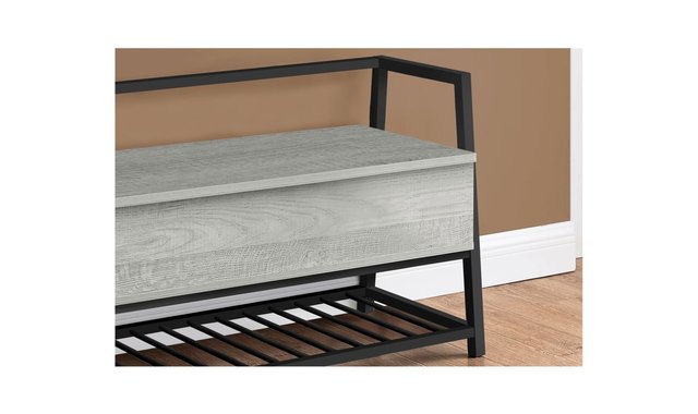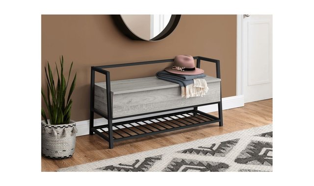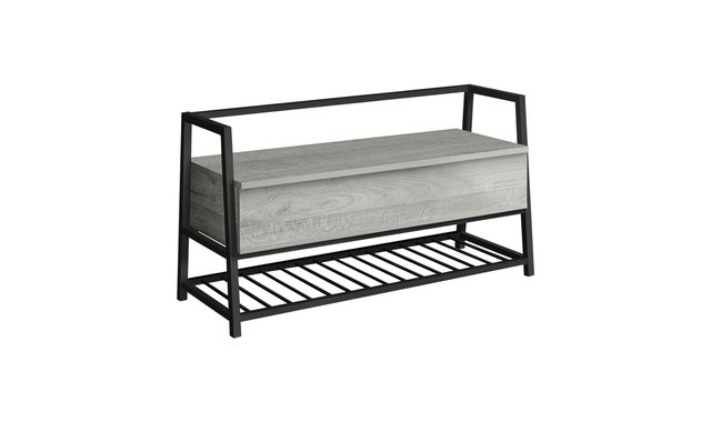 This storage bench combines a flip-top storage bench and a shoe rack. It is finished on all sides in grey wood-look with a black metal frame. Keep your entryway or hallway clutter free with this versatile storage bench. The hinged top lifts to reveal a spacious interior storage cabinet. Under the bench is a shelf for neatly organizing shoes or other items. Conveniently sized and big in functionality, this storage bench in a grey wood-look finish with a black metal frame is brimming with style and substance. Assembly is required.