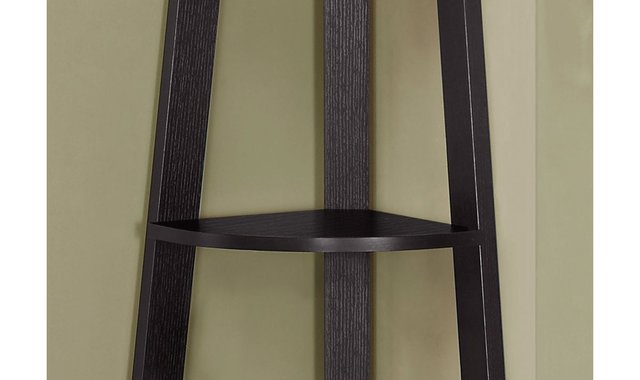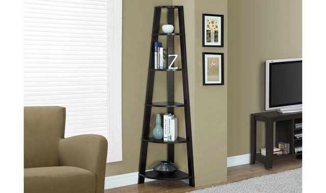 Configure this bookshelf easily and let it enhance your home. Enjoy a bookcase that fits neatly into your living room, office or bedroom, allowing you to use it for books and any type of decoration. A spot that's often hard to maximize – a corner – is no longer a problem with this modern cappuccino-coloured and wooden look cabinet that's sure to help you maximize the available space with 5 shelves. Three sturdy legs ensure the structural integrity of this corner shelf. Anti-tilt hardware is included for added stability. Maximize the space in the corner of your room; this shelf is ultra-practical. The bookcase fits perfectly in the corner; 5 shelves constructed of thick panels are ideal for books and other decorative items. Wood look finish in cappuccino is fashionable and blends with any style. Ideal for a living room, bedroom, office or hallway.