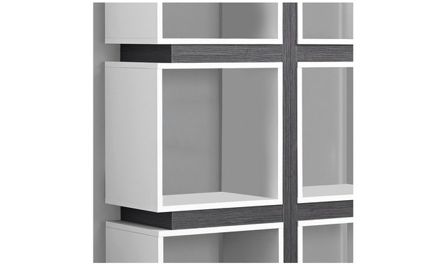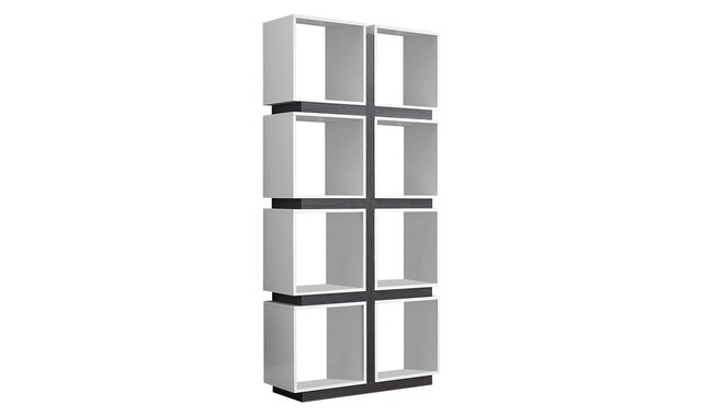 Give your home an art-deco style with this unique 8 cubes shelf. This perfectly symmetrical shelf offers 8 cubes as shelves to display your decorative items. With its open back, this piece can also be used as a divider. Finished in grey with white hollow-core shelves, this shelf will be the accent piece to any room. Browse the section below for other products that may be of interest to you for more ideas.
