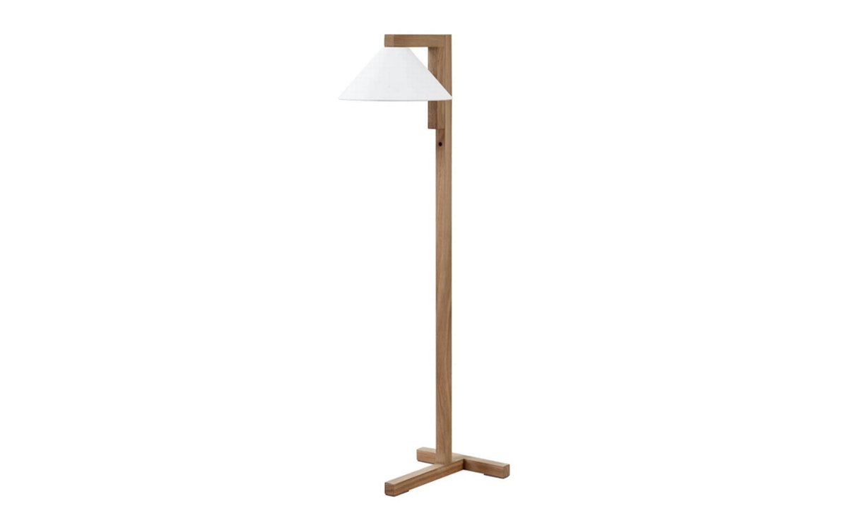 A timeless standing lamp with a classic oak frame and tapered linen shade, ideal for soft ambient lighting in transitional spaces.
