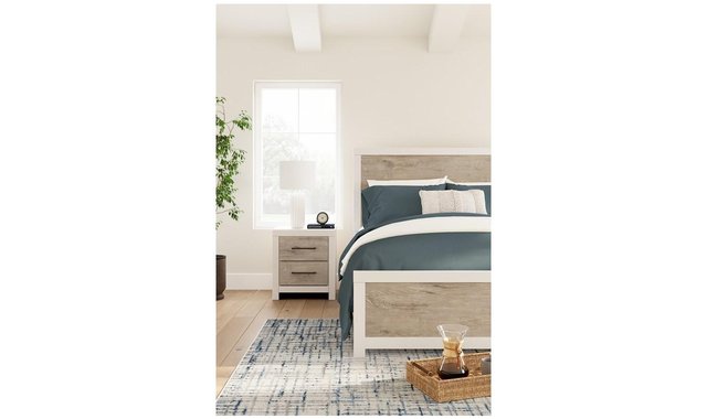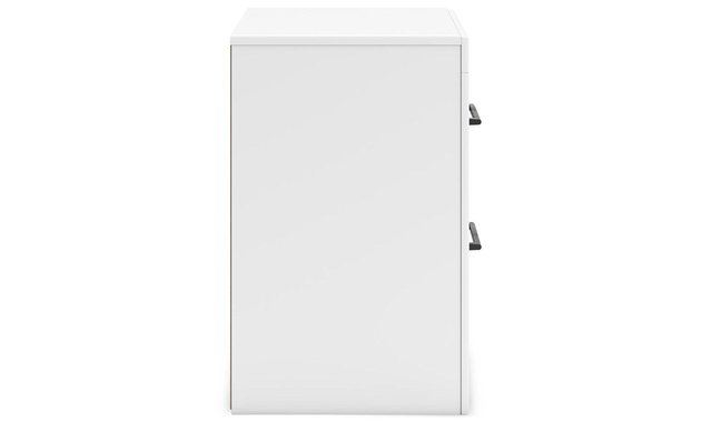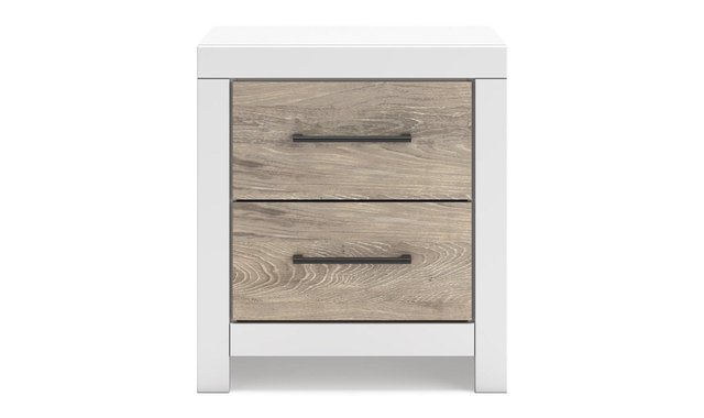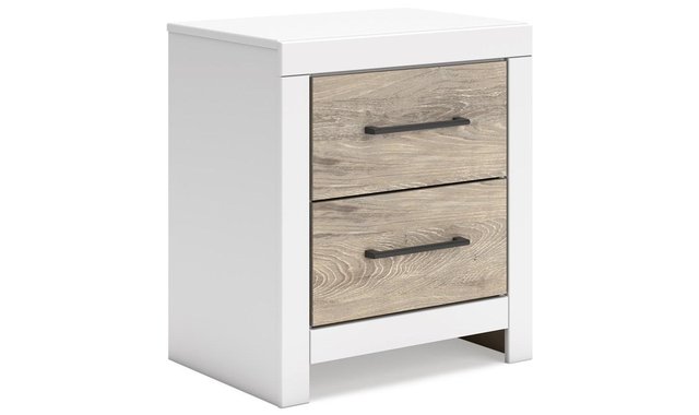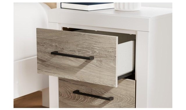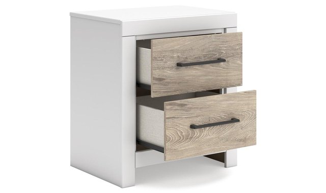 Relaxed yet striking, this nightstand brings casual beauty and function to your dream destination. A delightful two-tone treatment blends a fresh replicated oak grain with a matte white finish, while sleek handles in an antiqued gunmetal finish lend a contemporary touch. You're sure to love its spacious drawers that glide open and offer plenty of storage for nighttime essentials. Conveniently charge your devices using the USB charging ports on the back.