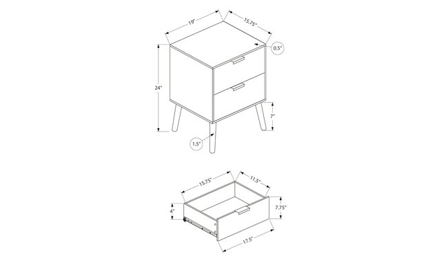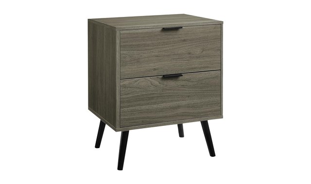Elevate your living space with this chic accent table, a perfect blend of modern design and practical functionality. Standing at a stylish 24 inches high, this contemporary end table features a sleek wood-look, grey laminate finish on all sides. Durably designed with black solid wood legs, ensuring stability and longevity whether placed in a bedroom, living room, or office. Featuring two convenient storage drawers with black metal handles, this accent table is designed for quick access to your essentials, while the easy to clean top allows you to maintain its pristine appearance with minimal effort. With its space saving design, this versatile piece can be used as a nightstand or side table to seamlessly fits into tight spaces, making it an essential addition to your home decor. Easy to assemble with illustrated instructions included and backed by a 5 year limited warranty against manufacturer defects, ensuring a quality purchase with long-lasting appeal. Transform your space effortlessly with our grey wood-look accent table, where utility meets fashionable style.