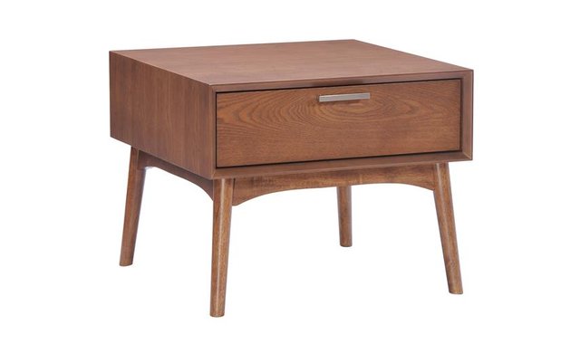 With its mid-century aesthetic, the Design District Side Table has clean lines and warm walnut tones. It has beautiful drawers with rails and stainless steel handles. It is a great piece of design.