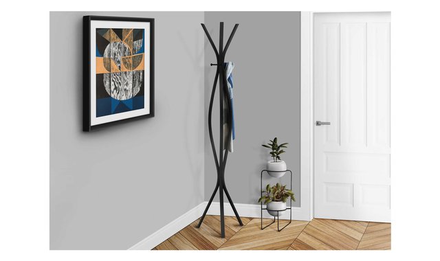 Are you looking for a stylish way to keep coats neatly organized and easily accessible? The wave shape of this freestanding coat rack will bring an elegant, contemporary look to your entryway, hallway, or office. It includes 3 hooks with a long, peg-like shape for securely hanging your most-used jackets, scarves, or bags. Ideal for smaller rooms, this black metal hall tree has a streamlined look and compact profile that won't take up a lot of space in a corner or next to a door.