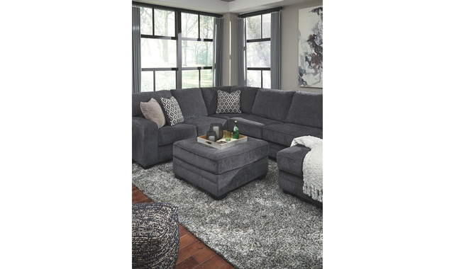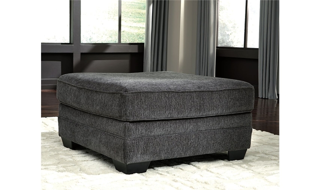 The ultimate sectional centerpiece, this oversized ottoman is big on cool, contemporary style and long on comfort. Plushly upholstered in a slate gray fabric, this ottoman is so generously scaled, you can top it with a serving tray and still have plenty of room to kick up your heels.