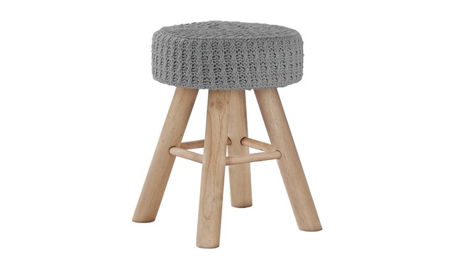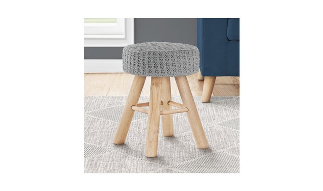 Simple in design but varied in function, this ottoman is a resourceful sidekick for a sofa or chair in a living room or bedroom. As a foot stool it's a soft place to kick up your feet, as a makeshift table it's a convenient surface to lay down a book or mobile device, and as a portable stool it's an extra seat where and when you need it. The round padded seat offers a comfortable feel and is upholstered in a grey knit fabric for a distinctive look. Slanted, cylindrical wood legs and footrests provide support and have a natural color that coordinates with most décors.