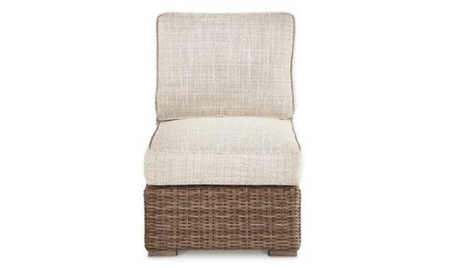 Sporting an easy-on-the-eyes look inspired by driftwood, this cushioned armless chair elevates the art of indoor-outdoor living. Beautiful and durable enough for indoor and outdoor use, the high-style/low-maintenance armless chair entices with plush, removable cushions wrapped in Nuvella® fabric that’s a breeze to keep clean. All-weather resin wicker handwoven over powder coated rust-proof aluminum frame Zippered cushions covered in high-performing Nuvella® fabric All-weather foam cushion core wrapped in soft polyester Clean fabric with mild soap and water, let air dry; for stubborn stains, use a solution of 1 cup bleach to 1 gallon water Imported fabric and fill Assembly required