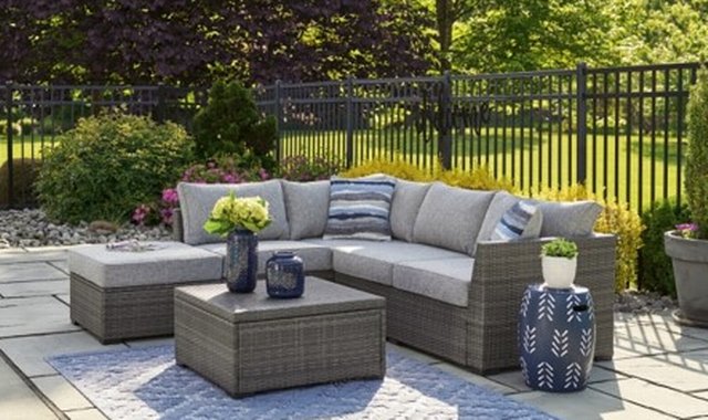 Effortlessly revamp your outdoor space into a sweet retreat with this seating set. High style crafted for low-maintenance living, the decidedly clean and contemporary ensemble entices in an easy-breezy gray for an upscale aesthetic that’s downright durable. Stage and rearrange as you please—the modular design of the pieces provides must-have versatility. And for another layer of function? Handy storage under the tabletop. Includes modular loveseat sectional, ottoman and table All-weather resin wicker handwoven over rust-free aluminum frame with durable powder coated finish Nuvella® (solution-dyed polyester) high-performance fabric Stainless steel hardware Designed to withstand the harsh elements of the outdoors Table with storage under tabletop Throw pillows included Clean fabric with mild soap and water, let air dry; for stubborn stains, use a solution of 1 cup bleach to 1 gallon water Assembly required