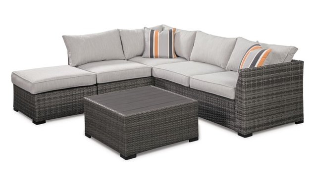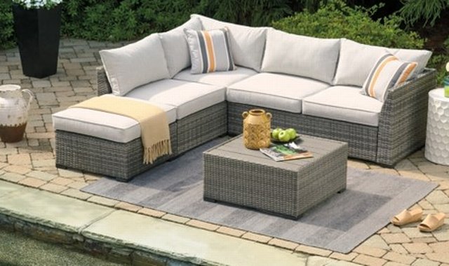 Outdoor furniture - Sectional & Table - P301-070 90 po l 85,5 po p 31,5 po h Table 30x30x14 h Turn your outdoor space into a sweet retreat with this 4-piece outdoor sectional. High style crafted for low-maintenance living, this decidedly clean and contemporary outdoor furniture set entices in an easy-breezy gray resin wicker over a rust-free aluminum frame for an upscale aesthetic that’s downright durable. Wrapped in high-performing Nuvella® fabric, the plush cushions are indulgently comfortable yet so carefree. Includes sectional (with loveseat/ottoman) and coffee table All-weather resin wicker handwoven over rust-free aluminum frame Resin wood-look tabletop Zippered cushions covered in high-performing Nuvella® fabric All-weather foam cushion core wrapped in soft polyester Imported fabric and fill Includes 2 throw pillows Clean fabric with mild soap and water, let air dry; for stubborn stains, use a solution of 1 cup bleach to 1 gallon water Assembly required