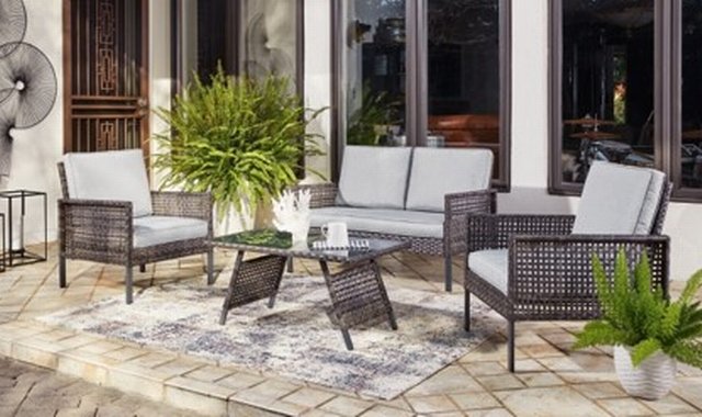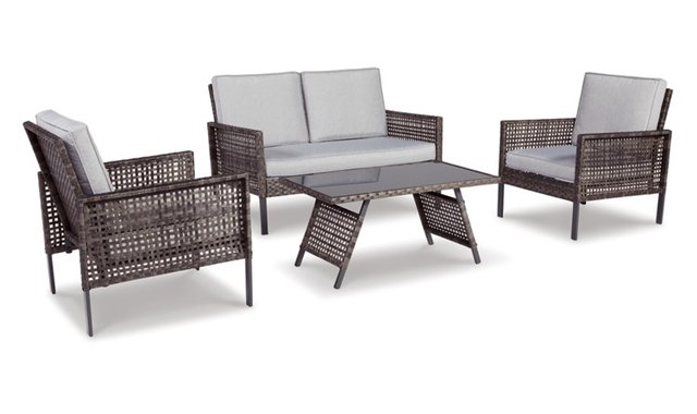 Outdoor furniture - 4 piece set - P338-080 High style crafted for low-maintenance living. Turn your outdoor space into a sweet retreat with this seating ensemble. The decidedly clean and contemporary furniture set entices in an easy-breezy gray resin wicker over a steel frame, for an upscale aesthetic that’s downright durable. Wrapped in high-performance Nuvella® fabric, the plush light gray cushions are indulgently comfortable yet so carefree. Table 36x20x17 h Chair 25x29x32 h Loveseat 47x29x32 Includes 2 chairs, loveseat and coffee table Made with resin wicker in gray tone Gray powder coated steel frame Stainless steel hardware Coffee table with gray glass top Cushions wrapped in high-performance Nuvella® fabric Assembly required