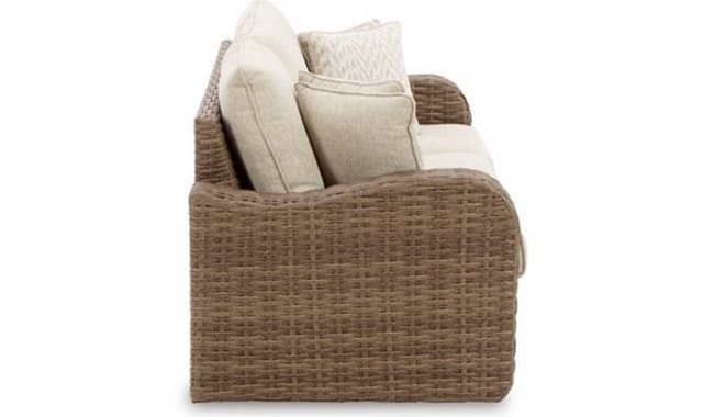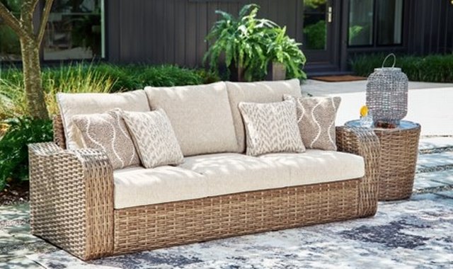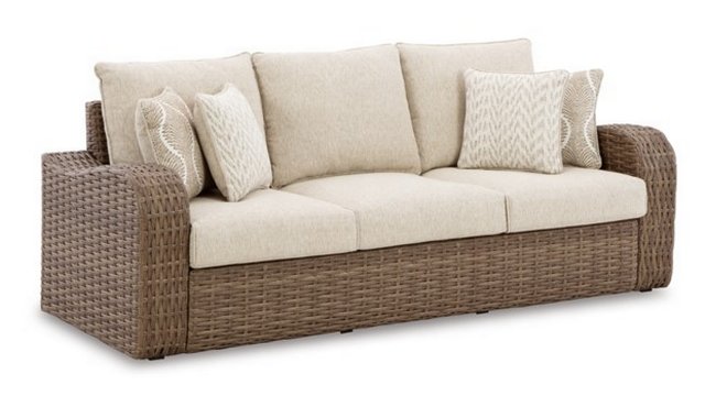 Outdoor furniture - Sofa - P507-838 Indulge in style that suits your easy-breezy sensibilities. This sofa crafts a richly relaxed feel in your outdoor seating area. The driftwood hue of its durable resin wicker invites your casually cool aesthetic alfresco, with plush cushions wrapped in high-performance Nuvella+™ fabric providing ultimate comfort. All-weather wicker furniture with aluminum frame Solution-dyed high-performance fabric Nuvella+ is an outdoor fabric that can be cleaned and offers enhanced UV resistance Clean fabric with mild soap and water, let air dry; for stubborn stains, use a solution of 1 cup bleach to 1 gallon water All-weather foam cushion core wrapped in soft polyester Stainless steel hardware Designed to withstand the harsh elements of the outdoors 4 throw pillows included Imported fabric and fill Assembly required