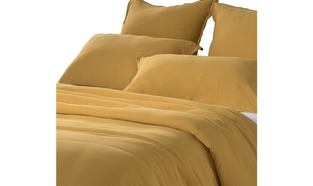 Muslin yellow duvet cover Double-queen size duvet cover: 88' x 90' King size duvet cover: 104' x 90' Decorative pillow shams sold separately 100% cotton muslin Zipper closure Machine washable and dryable Made in Portugal