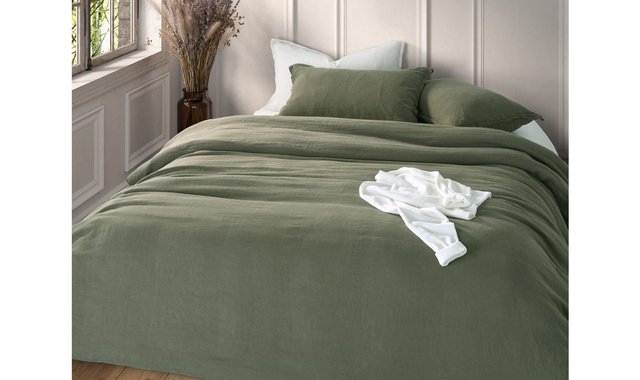 LIN OLIVE LINEN DUVET COVER AND 2 DECORATIVE PILLOW SHAMS Elegant, comfortable and breathable, linen just feels good! olive linen duvet cover Double-queen size duvet cover: 88'' x 90'' King size duvet cover: 104'' x 90'' 100% European washed linen Oeko-tex certified Made in Portugal Zipper closure Machine washable and dryable