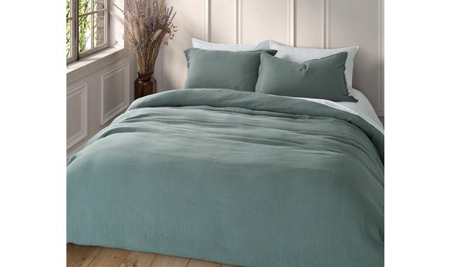 LIN BLUE LINEN DUVET COVER AND 2 DECORATIVE PILLOW SHAMS Elegant, comfortable and breathable, linen just feels good! blue linen duvet cover Double-queen size duvet cover: 88'' x 90'' King size duvet cover: 104'' x 90'' 100% European washed linen Oeko-tex certified Made in Portugal Zipper closure Machine washable and dryable