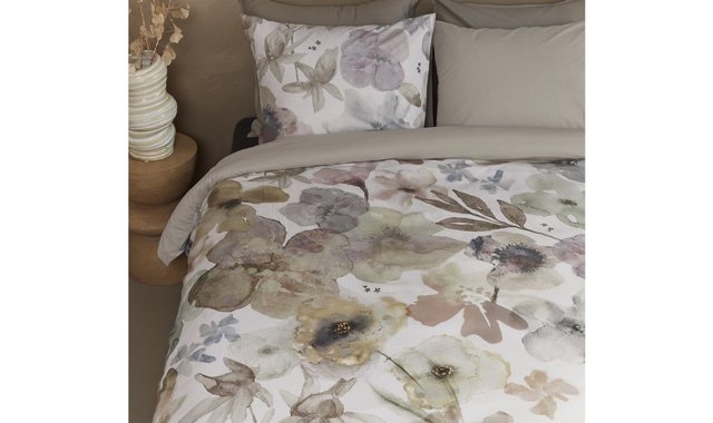 Duvet cover set featuring pastel watercolour flowers From our JO&ME brand Double-queen size set includes: 1 duvet cover 88'' x 90'', 2 pillow shams 20'' x 30'' King size set includes: 1 duvet cover 104’’ x 90’’, 2 pillow shams 20’’ x 36’’ Zipper closure Inside corner ties to help secure the duvet insert 100% cotton Machine washable and dryable
