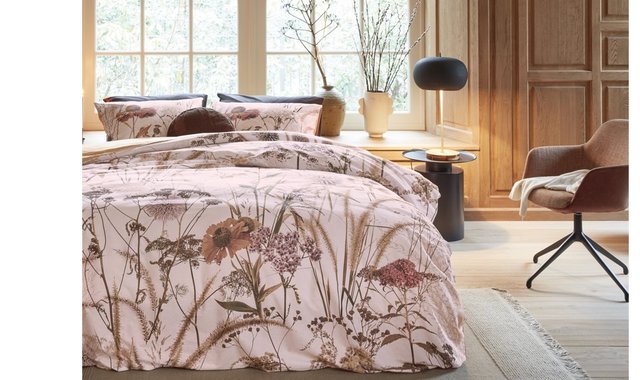 Flowered duvet cover set in shades of terracotta, brown and beige on a soft pink background From our JO&ME brand Double-queen size set includes: 1 duvet cover 88'' x 90'', 2 pillow shams 20'' x 30'' King size set includes: 1 duvet cover 104'' x 90'', 2 pillow shams 20'' x 36'' Zipper closure Inside corner ties to help secure the duvet insert 100% cotton Machine washable and dryable