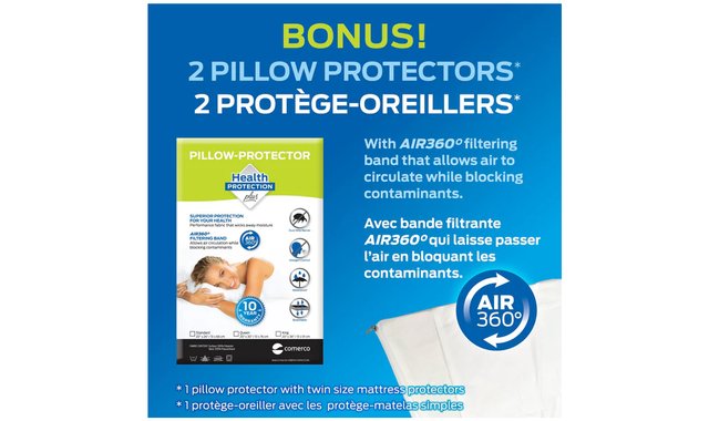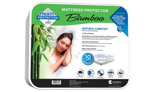 Comerco Bamboo Mattress Protector, 100% Waterproof, soft, Breathable, 10 Year Warranty against stains on new mattresses and on mattress protector, includes 2 pillow protectors for your comfort and protection. - 10 Year Warranty against stains on new mattress (conditions apply). - 10 Year Warranty against stains on mattress protector. 100% waterproof and breathable: maintaining a clean and hygienic sleeping surface by eliminating the build-up of dust mites, mold, mildew, fungus and bacteria. BONUS BED SET: 2 PILLOW PROTECTORS with AIR360° filtering band that allows air to circulate while blocking contaminants (Twin – 1 pillow protector only). - Natural comfort: Bamboo Jacquard Surface. - Total Health Protection: allergens from dust mites, mold and mildew in your mattress and pillows can trigger health problems. - Advanced technology that harmonizes with the comfort of your mattress. - Deep Stretch Skirt: stretches to fit 10”- 20” mattresses. - Waterproof protection: prevents you from losing the validity of your mattress warranty. - Machine washable and tumble dry.