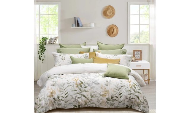 The Aspen Duvet Cover Set boasts a botanical design of beautiful green and gold tones on a crisp off-white background. Elevate your bedroom décor with this stunning and sophisticated set. Made from high-quality materials, it offers both style and comfort for a luxurious sleeping experience. Transform your room into a tranquil oasis with the Aspen Duvet Cover Set. 300 Threadcount 100% cotton sateen. Hidden 60” zipper on the side for easy removal and cleaning Machine Washable