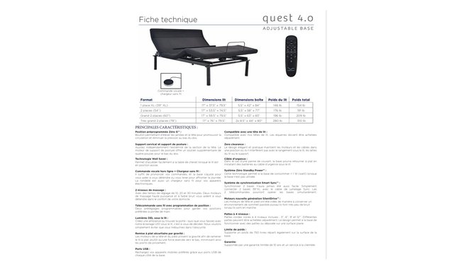 With the adjustable Quest 4.0 bed, you have everything you need for a restorative sleep. Its numerous features, such as its posture support, cervical support, relaxation motors, etc., allow you to customize your bed, making it versatile to meet all your needs.