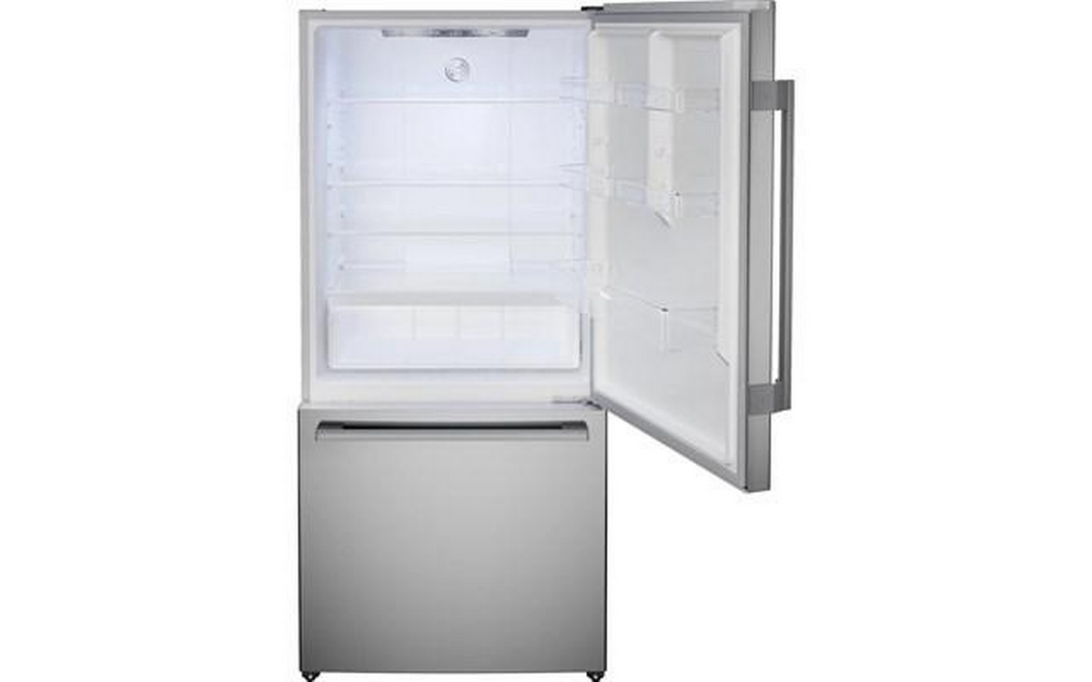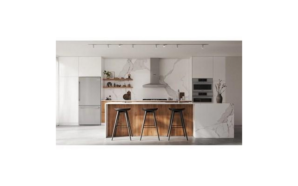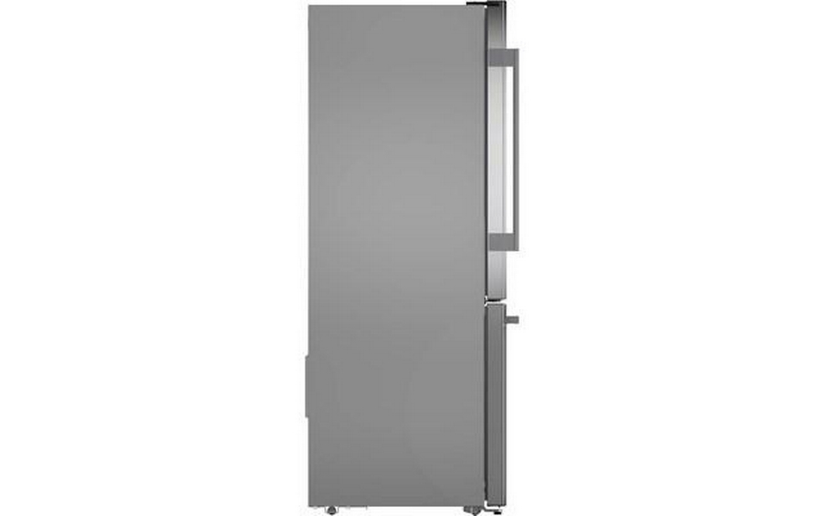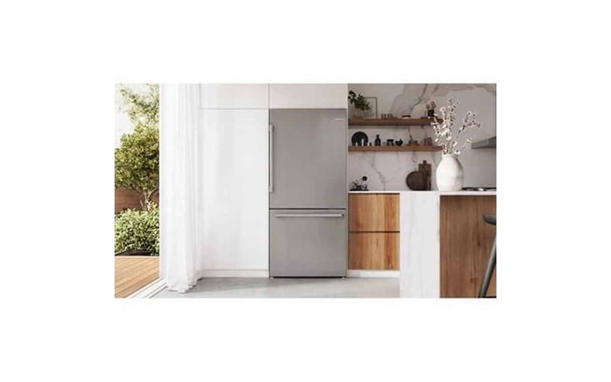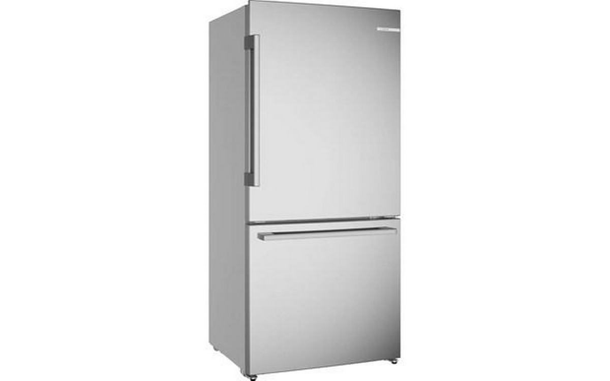 Bosch 100 Series Freestanding Bottom Freezer Refrigerator in anti-fingerprint brushed steel. It features Total No Frost, Glossy Backwall with Multi Airflow, LED lighting and the Super Cooling function that cools new food placed inside faster, thus protecting already cooled food.