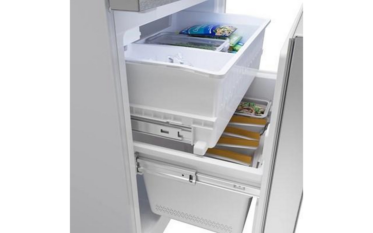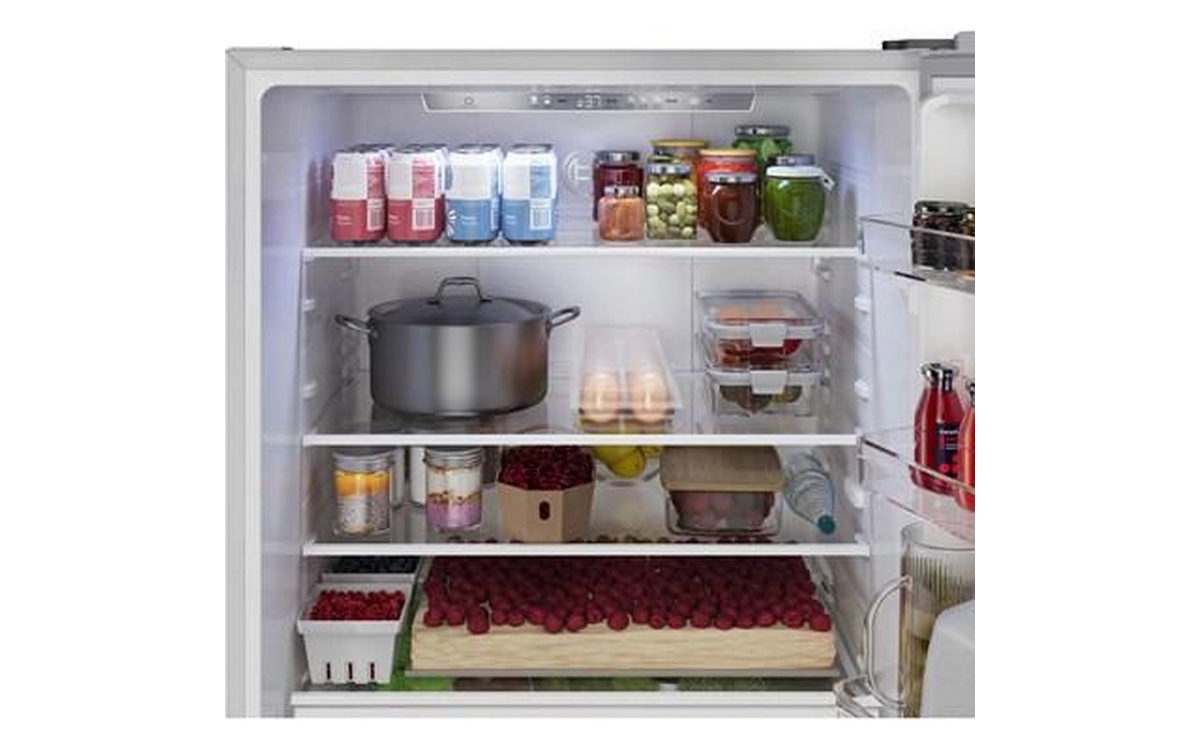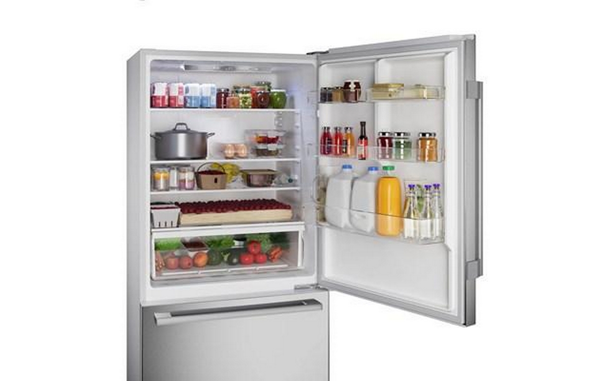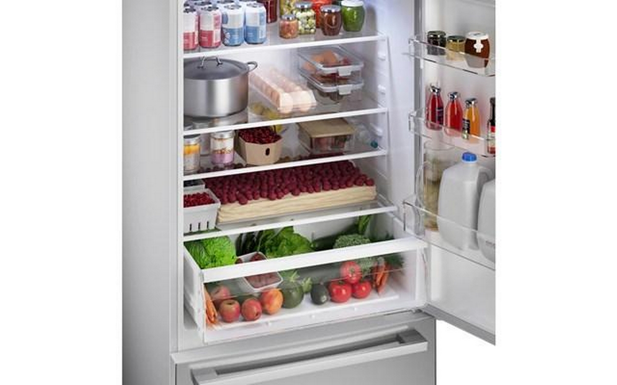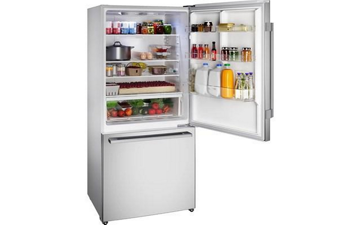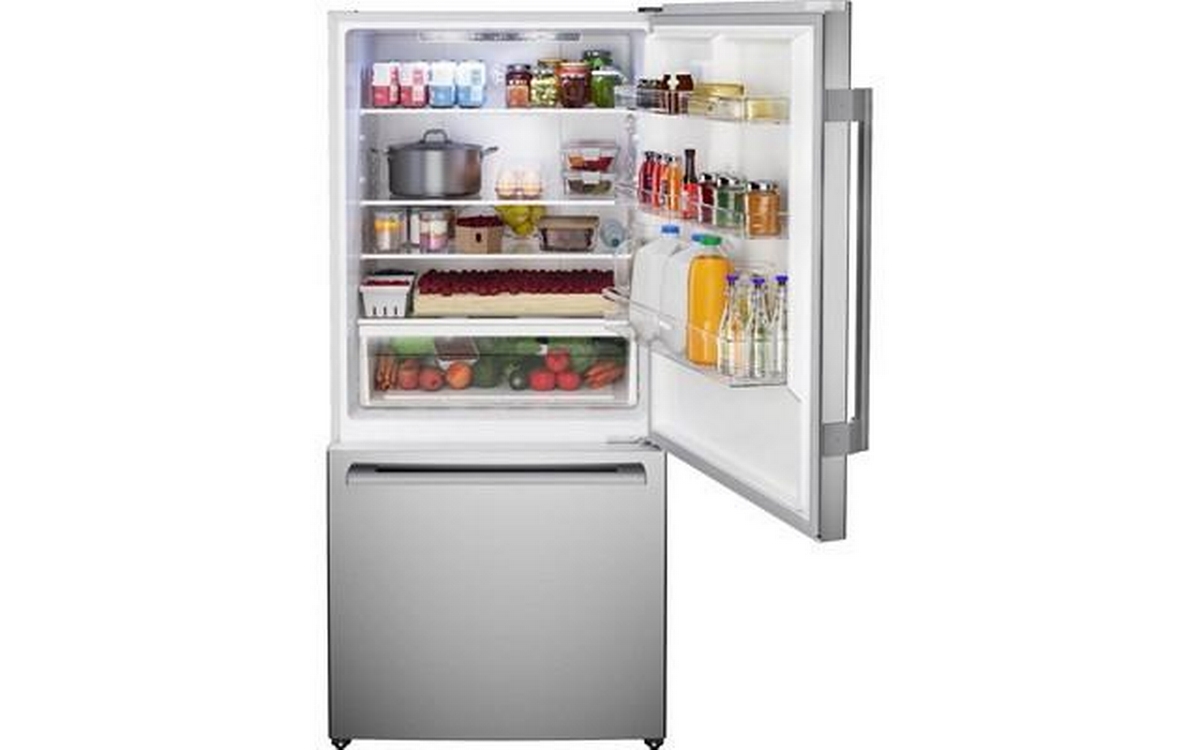 Bosch 100 Series Freestanding Bottom Freezer Refrigerator in anti-fingerprint brushed steel. It features Total No Frost, Glossy Backwall with Multi Airflow, LED lighting and the Super Cooling function that cools new food placed inside faster, thus protecting already cooled food.