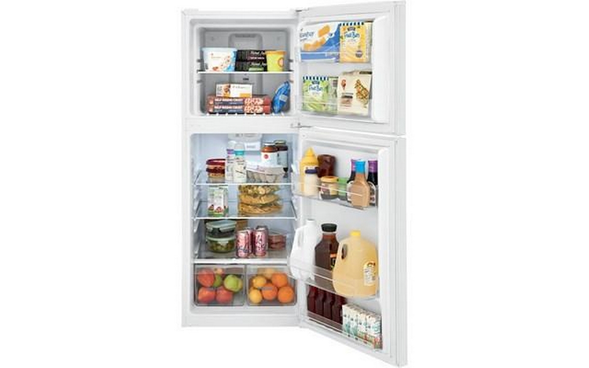 This Frigidaire 11.6 cu. ft. top freezer apartment size refrigerator features Spacewise® adjustable glass shelves, Store-More™ door bins and Store-More™ humidity-controlled crisper drawers.