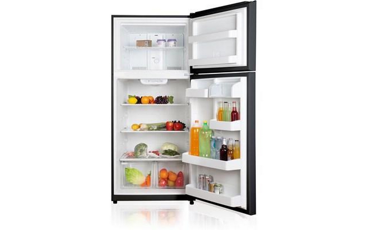 GE Energy Star 18 cu. ft. top-freezer, frost-free refrigerator with a reversible door to easily change how the fridge door swings to suit your needs. It offers two humidity-controlled drawers to help preserve fruits, cheeses and vegetables and one clear dairy compartment.