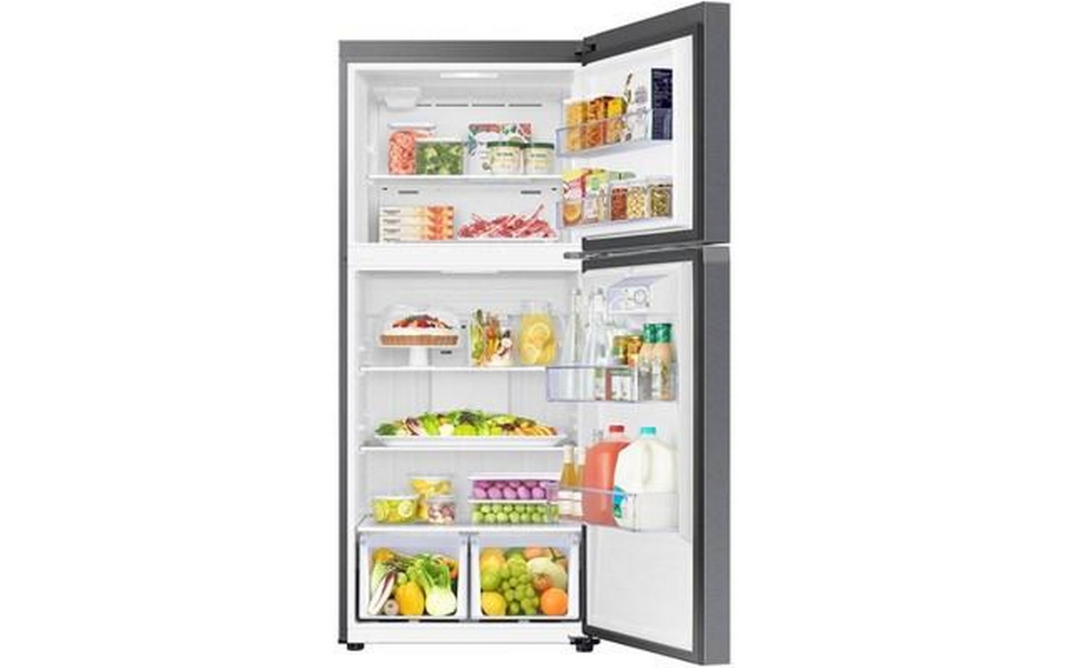 Samsung 17.5 cu. ft. top freezer refrigerator features SmartThings AI Energy, LED lighting, door alarm, crisper drawers and Wi-Fi.