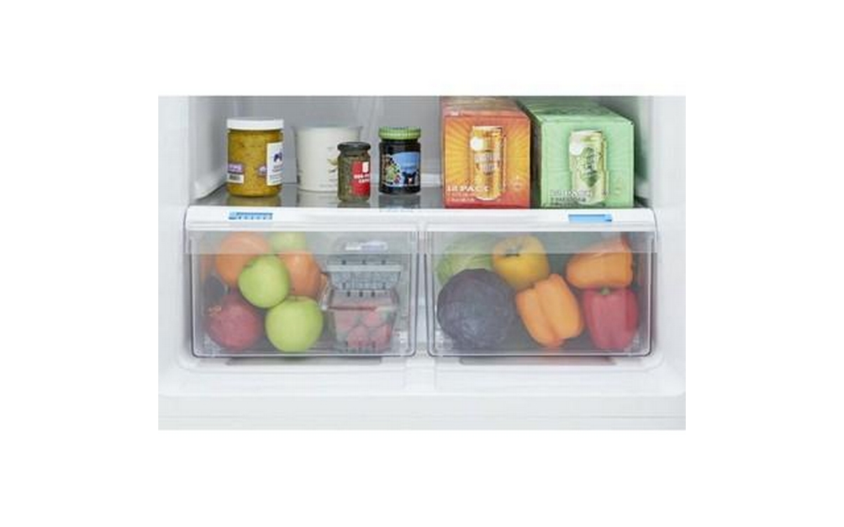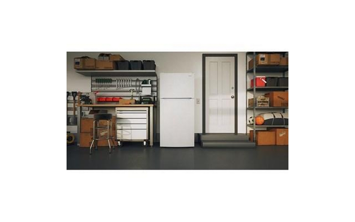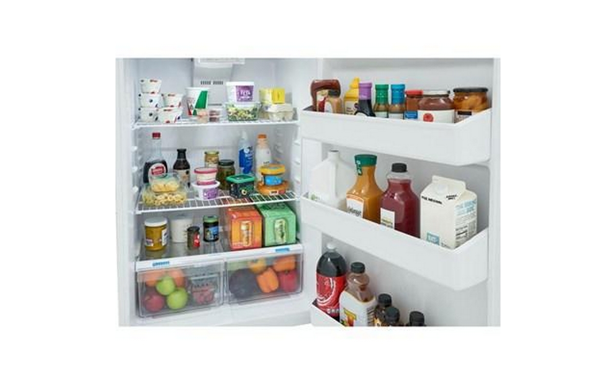 The Frigidaire 18.17 cu. ft. Top Freezer Refrigerator is garage ready and features bright LED lighting, full-width glass shelves, and a spacious layout ideal for everyday storage.