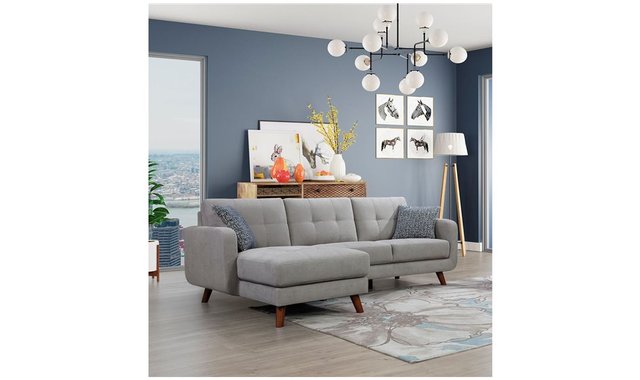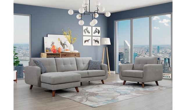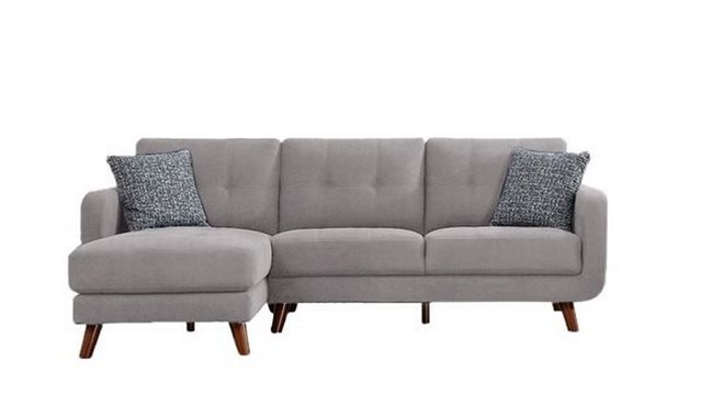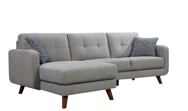 Add contemporary freshness to your living space with the graceful shapes and contrasting colours of this seating collection. Taking inspiration from Mid-Century Modern design, this comfortable 2-piece sectional has a left side chaise for stretching out. It boasts linen-like fabric with biscuit-tufted cushions, two textured accent pillows, and maple hardwood flared feet. Use it as your main seating or create the comfortable living room of your dreams with the coordinating chair, love seat, sofa, and storage ottoman. With this collection, you get high style and top quality all in one! Mid-Century modern inspired design influence Soft linen-like fabric upholstery Biscuit-tufting on back and seat cushions Exposed maple wood legs Solid wood construction High density foam padded seat construction over no-sag S-springs Includes two textured accent pillows