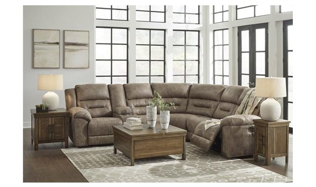 This power reclining sectional is designed exclusively for those who are serious about R&R. Its overstuffed cushions and pillow top arms feel oh-so-plush, and the faux leather upholstery accented with jumbo stitching is silky soft. Go from upright to reclined relaxation with just one touch. A clever center console provides storage and keeps drinks at the ready.