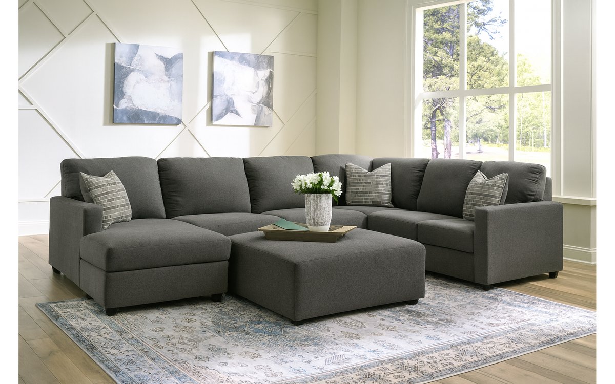 Includes left-arm facing corner chaise, armless loveseat and right-arm facing sofa with corner wedge