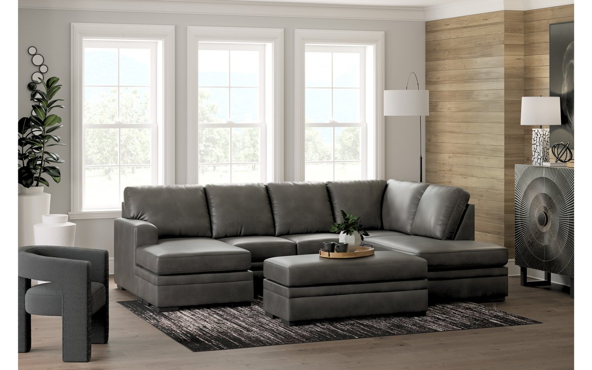 Searching for just the right blend of comfy and contemporary? Relax to your heart’s content on this posh and plush double-chaise sectional. Rest assured, this seating in charcoal suede-soft microfiber provides lots of room to kick back in style with a look that’s fresh and inviting.