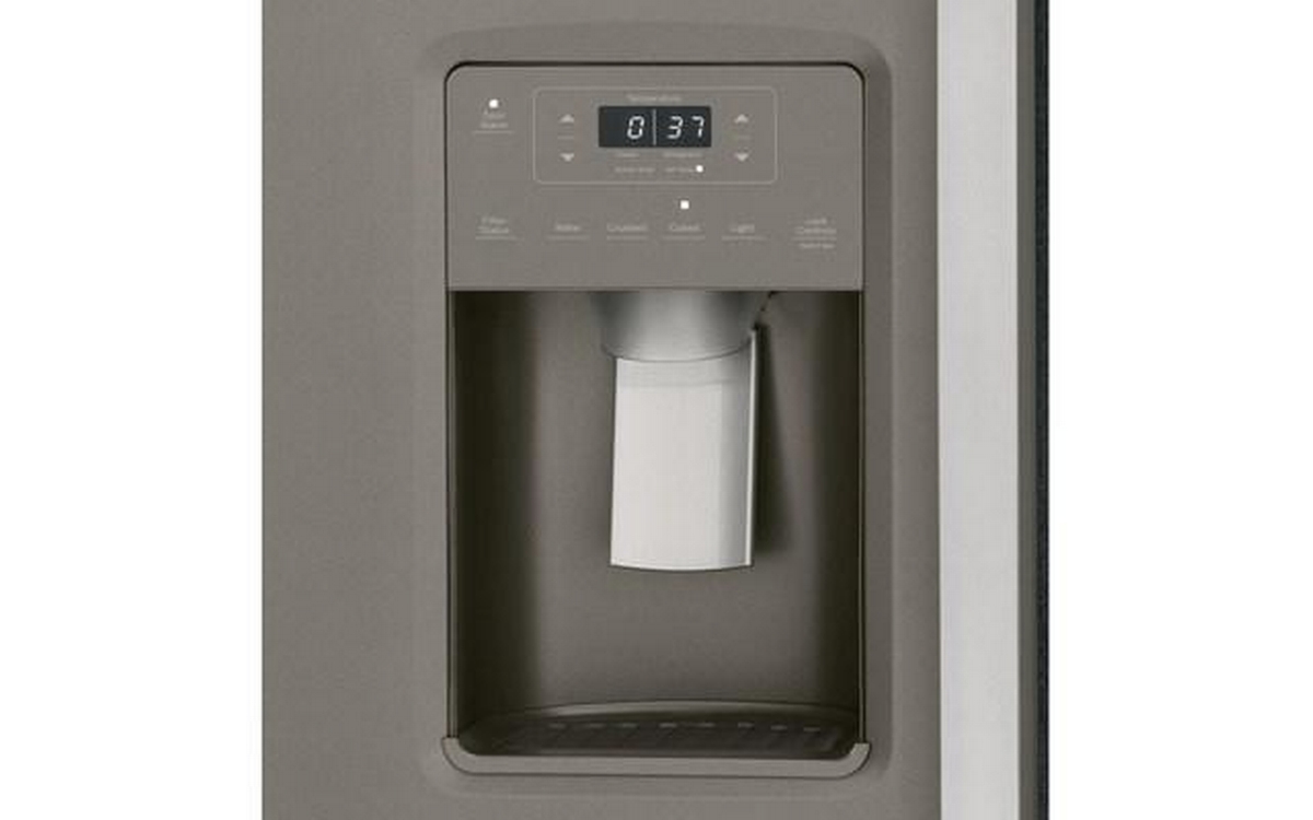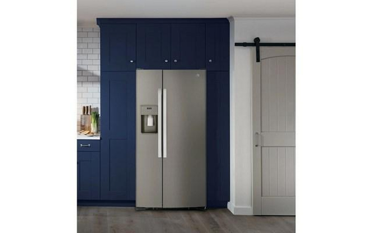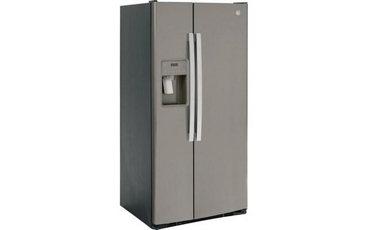 GE® 23.0 cu. ft. side-by-side refrigerator with water and ice dispenser. This refrigerator features Edge-to-Edge Shelves, Interior Storage Drawers, LED Lighting, Advanced Water Filtration and Electronic Display.