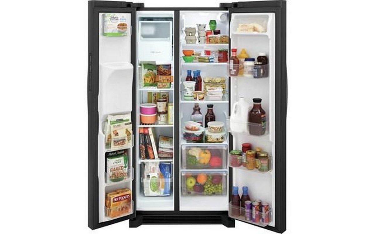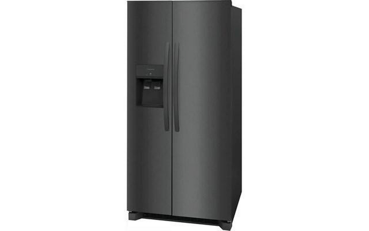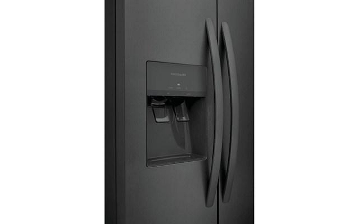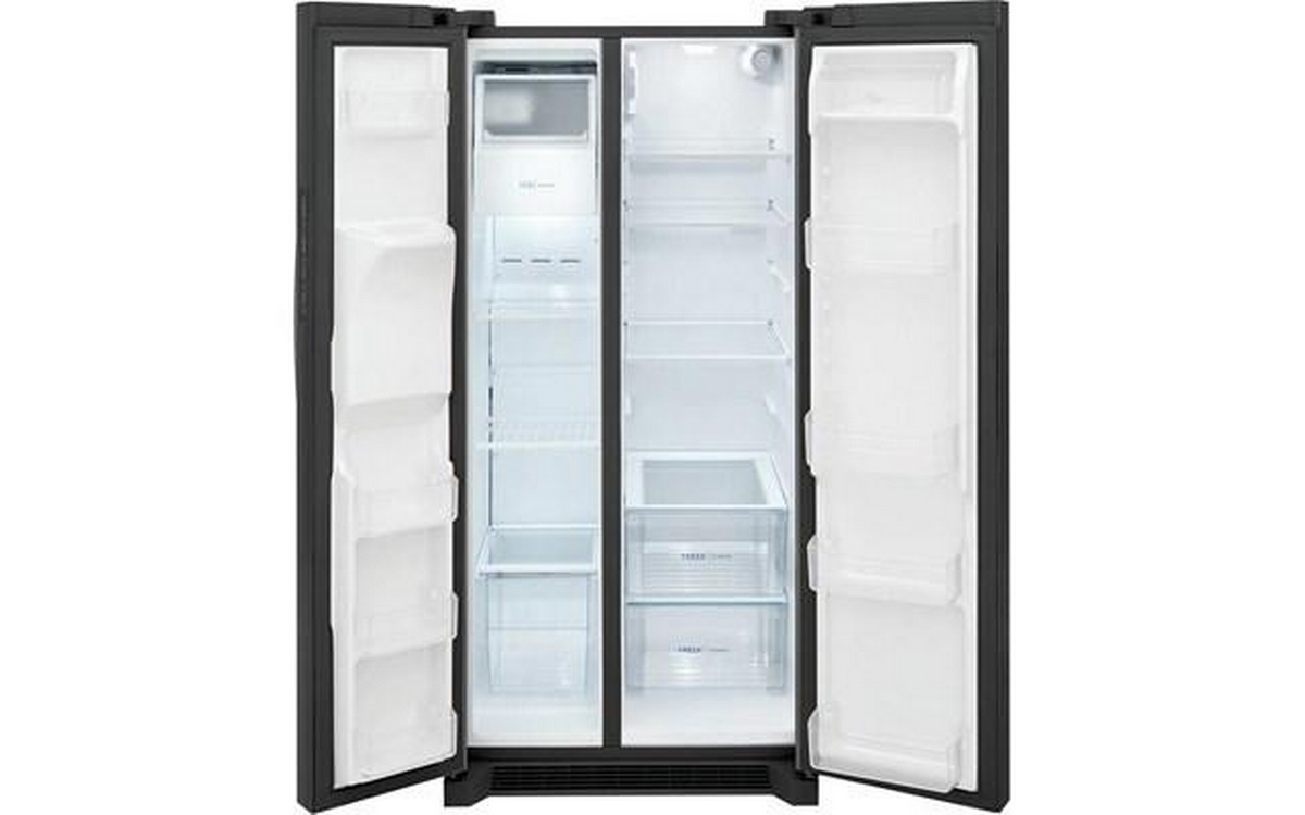This Frigidaire side-by-side refrigerator features external water and ice dispensing system, LED lighting, clear crisper drawers and a total capacity of 22.2 cu.ft.