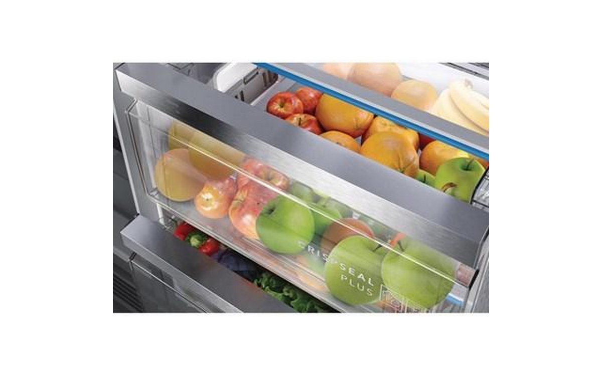 Frigidaire Professional 22.3 cu. ft. side-by-side refrigerator features an ice and water dispensing system, crisper drawers, digital temperature display and glass shelves.